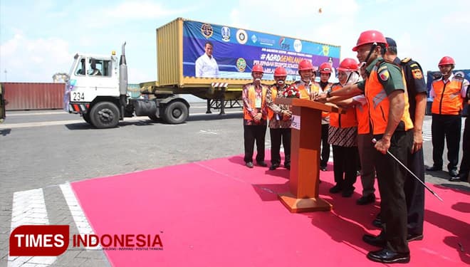 TIMES Bekasi/Gubernur Jawa Timur. Dra. Hj. Khofifah Indar Parawansa saat melepas ekspor komoditi pertanian di Terminal PetikEmas Surabaya (TPS). Kamis (21/3/2019). (FOTO: TIM Media For TIMES Indonesia)